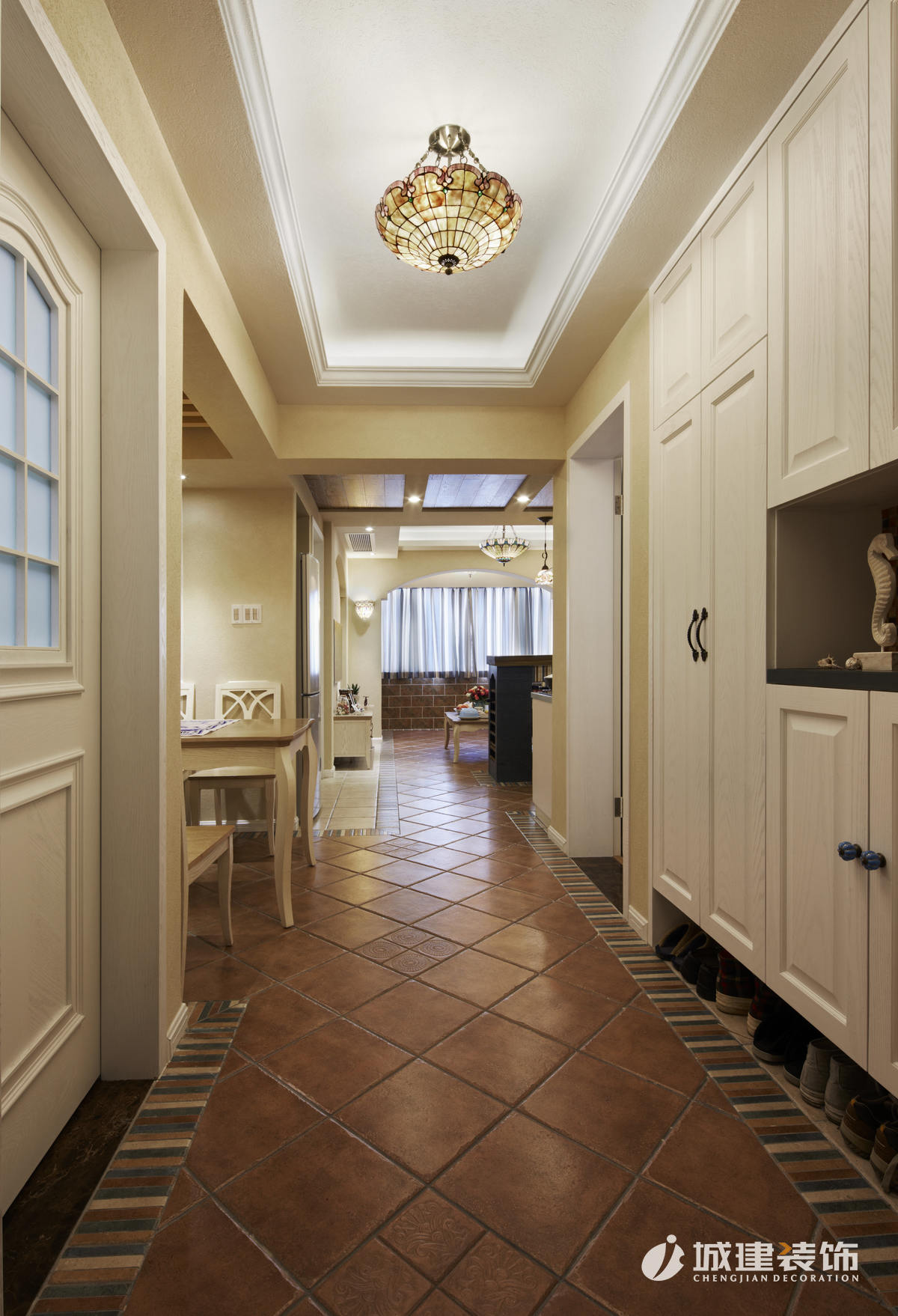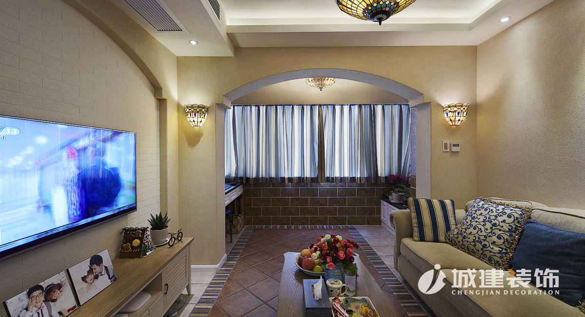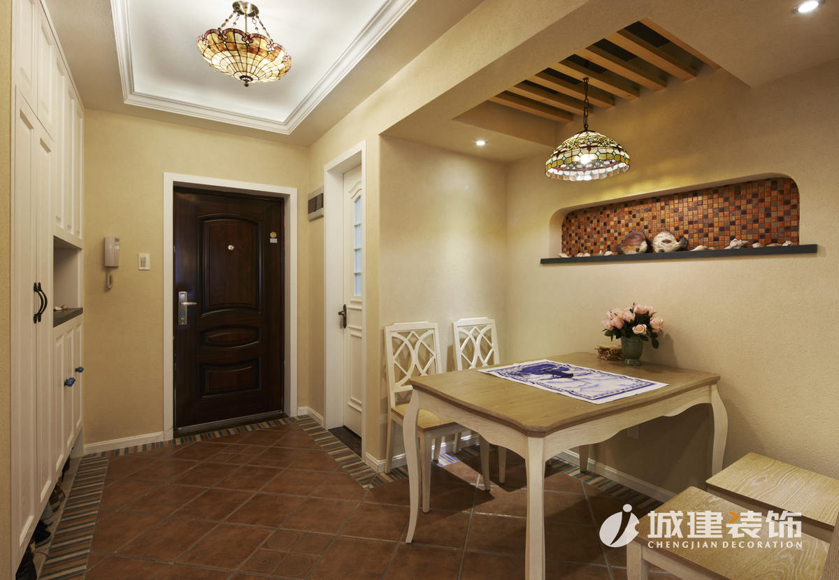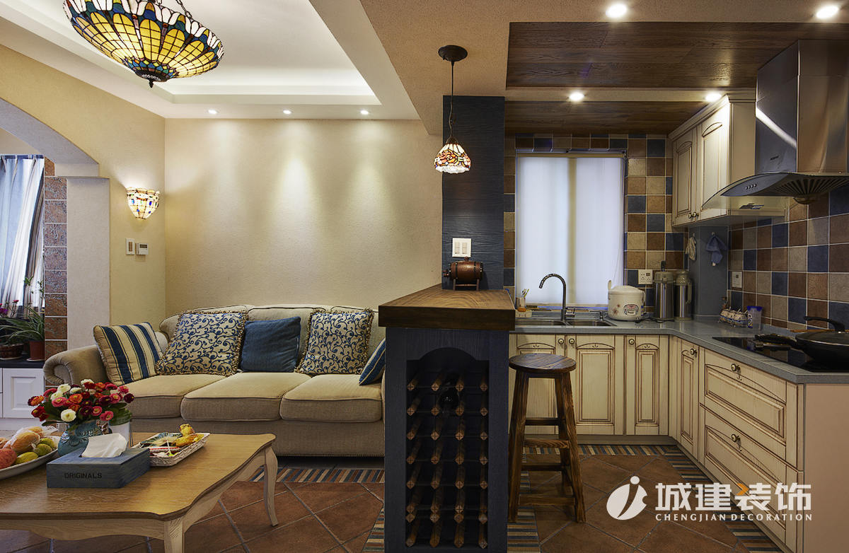 因為大面積使用硅藻泥,區(qū)別于一般地中海風味的白藍色調,本案以米色為主基調,仿若海邊沙灘,多處運用木質結構的原始風味,地面采用多種仿古磚的拼接,再配以地中海風的燈具進行點綴,達到畫龍點晴的效果,處處體現(xiàn)著家的溫馨舒適。