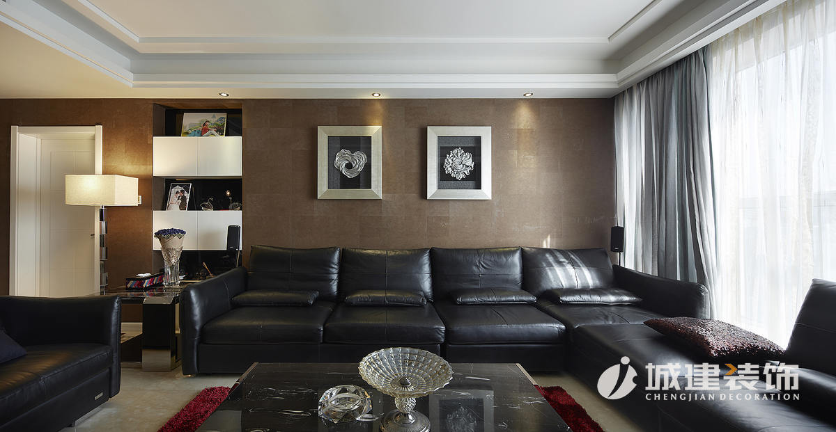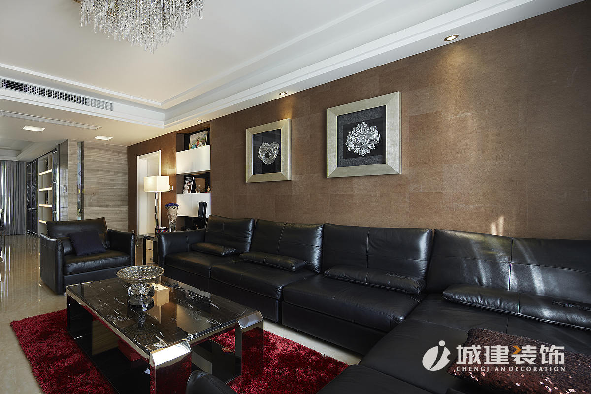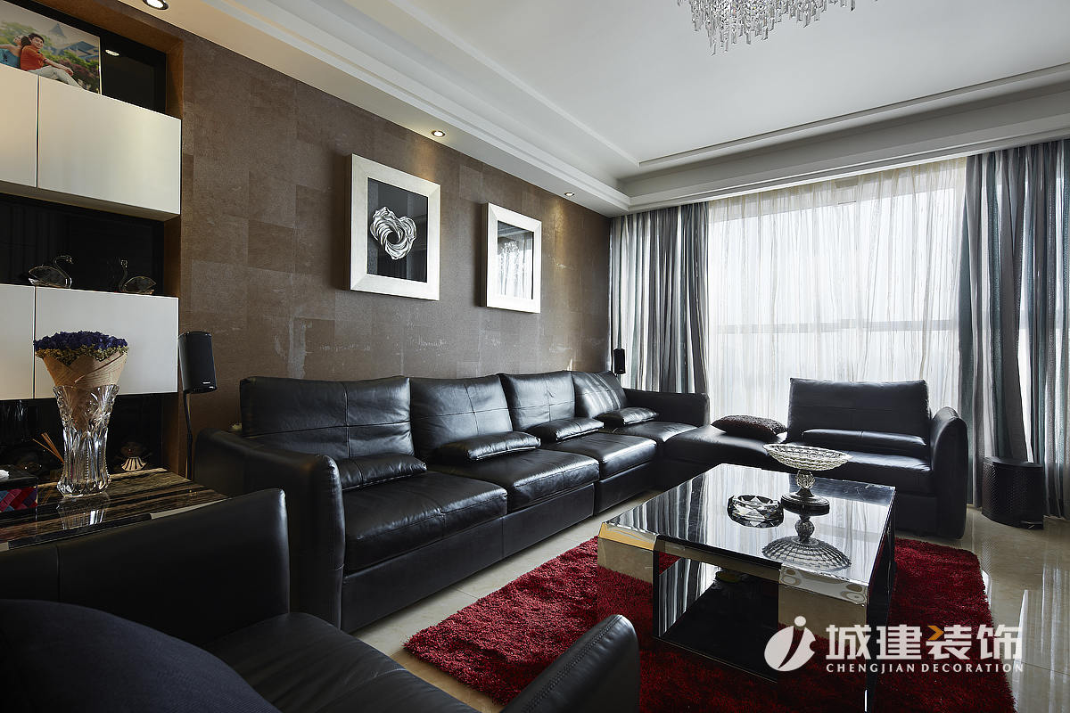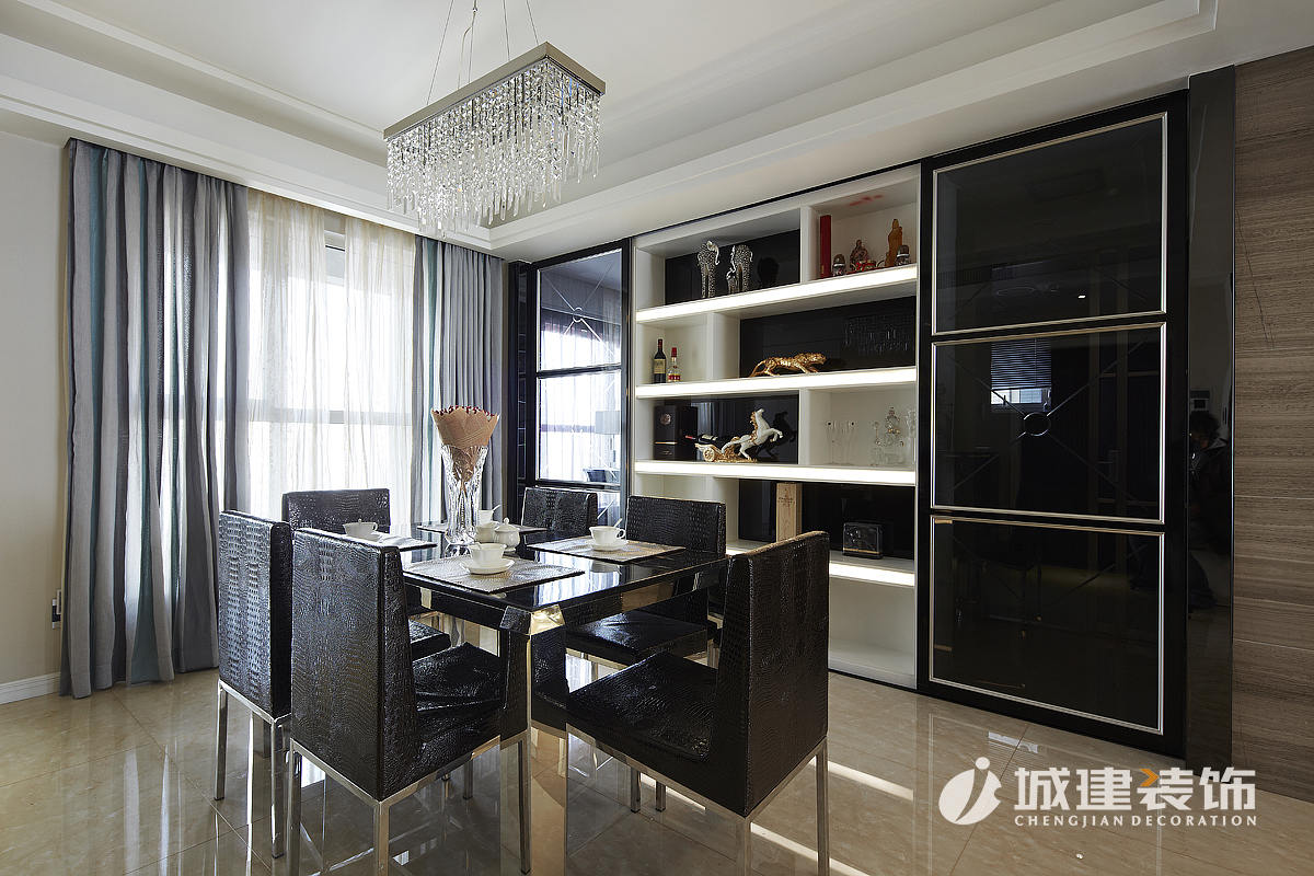 餐廳酒柜區(qū)域沿襲黑白主基調,兩側采用鏡面造型的移門,保證空間整體美觀度,同時解決了入戶門正對著衛(wèi)生間的弊端。