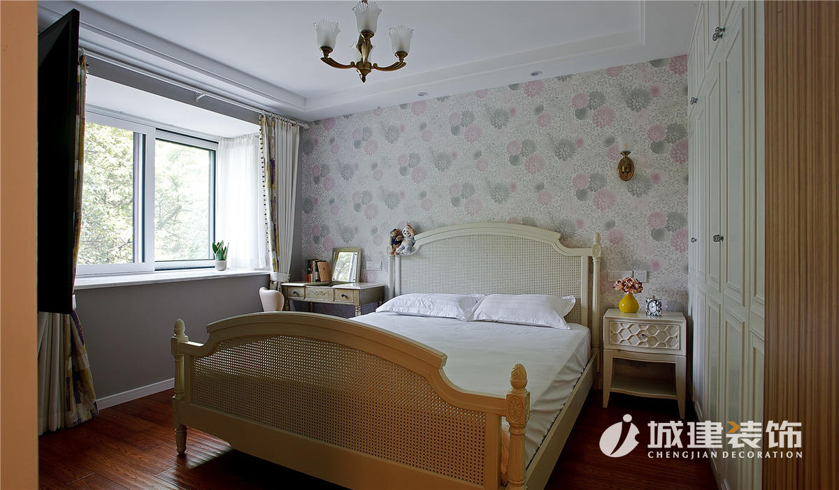 主臥和女兒房都以清新淡雅為主,主臥顏色更休閑穩(wěn)重,做了走入式的小衣帽間,移門顏色與墻面相呼應(yīng)。女兒房選擇了爛漫的花卉壁紙,做了整體白色的衣柜,包括梳妝臺和床頭柜都是精心挑選,精致美麗。