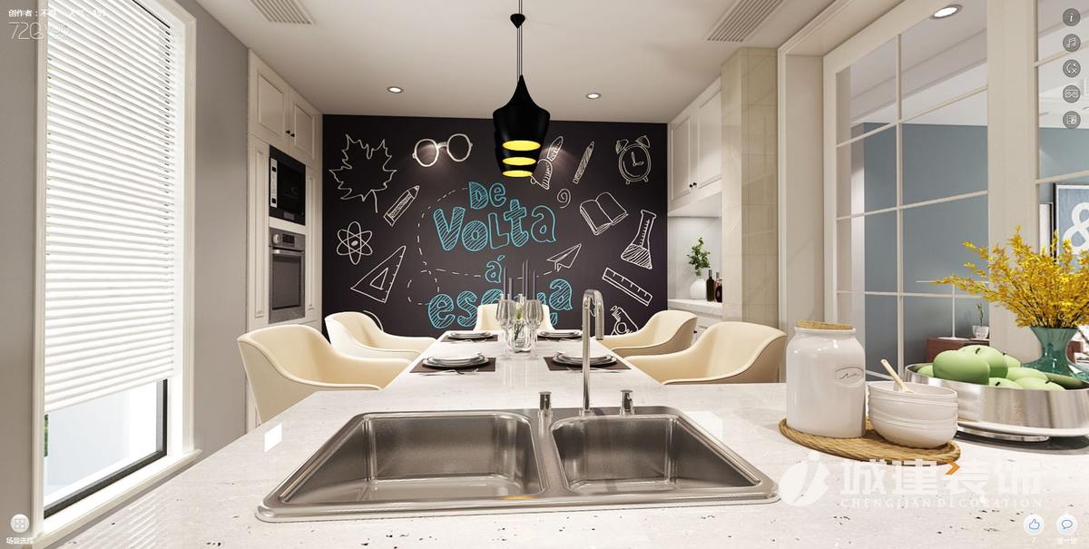 沒有繁瑣累贅的線條,鮮有璀璨奢華的元素,卻通過不同色塊之間的相互碰撞,干凈利落的講述了一個關于家的故事,給家以精致、溫暖的生活氣息。本案是一家四口的溫馨家庭。大膽的采用開放式廚房,通過中島與餐桌的連通增加家人互動的空間。整面的黑板墻讓充滿藝術細胞的寶貝有充分發(fā)揮自己靈感的空間。