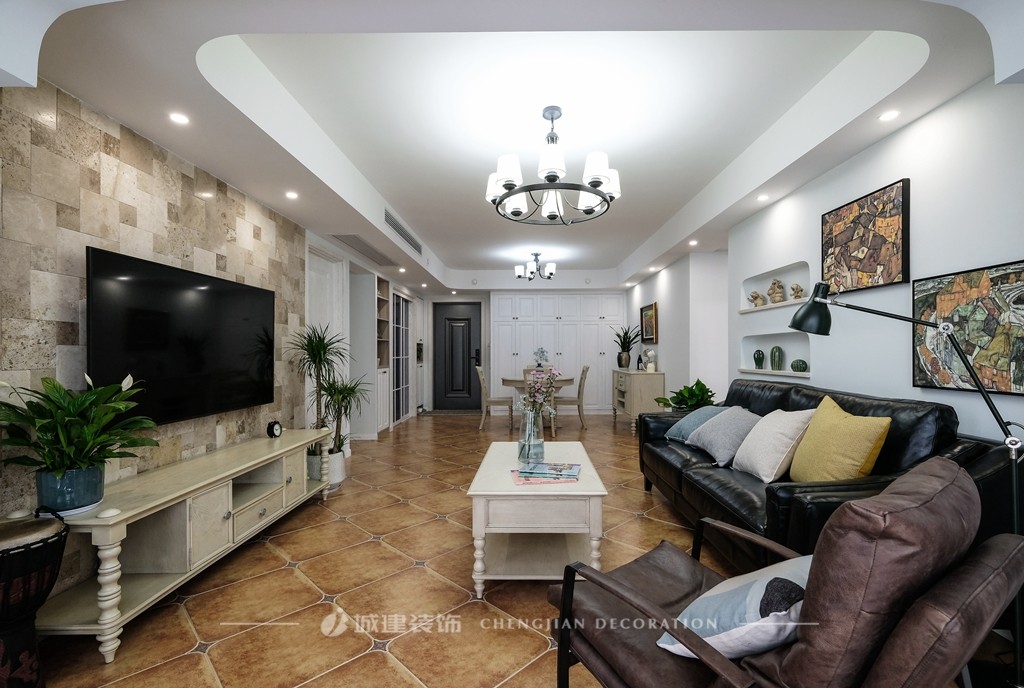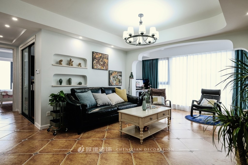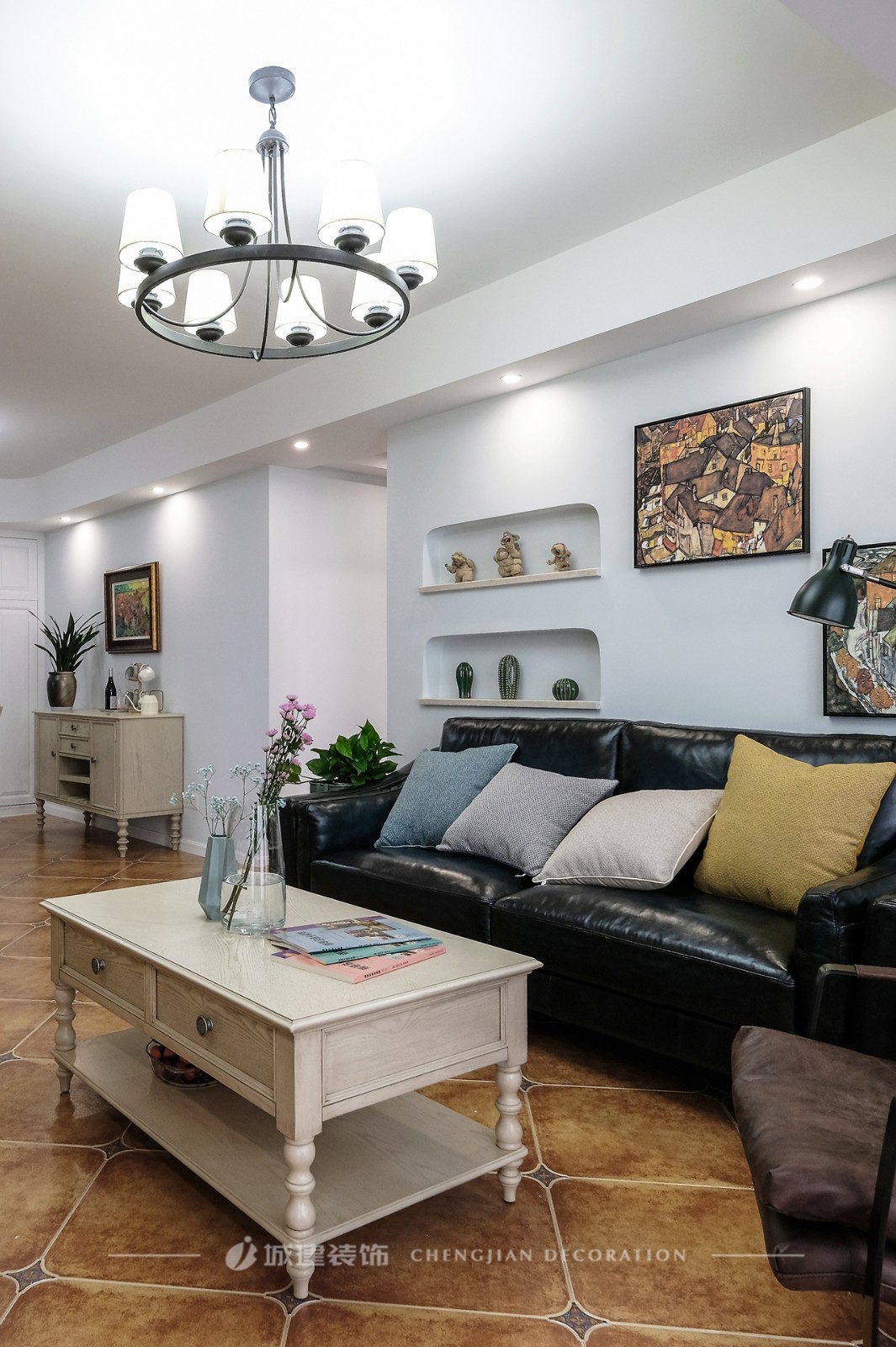 沙發(fā)背景墻設(shè)計(jì)兩個(gè)壁龕,陳列著屋主旅行帶回的精美藝術(shù)品,并用喜歡的畫(huà)作裝飾墻面,豐富空間層次。家里有了喜愛(ài)的元素,便充滿了溫馨。