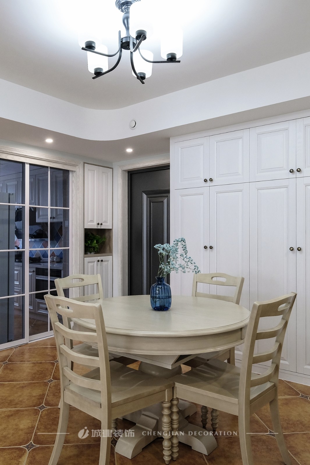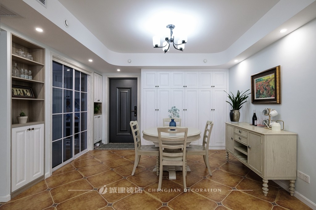 【客餐廳】保留原有的整體大空間,淺灰藍(lán)色的墻面營(yíng)造溫婉舒心的環(huán)境;仿古磚與復(fù)古美式家具傳遞出歲月留聲的怡然自得。