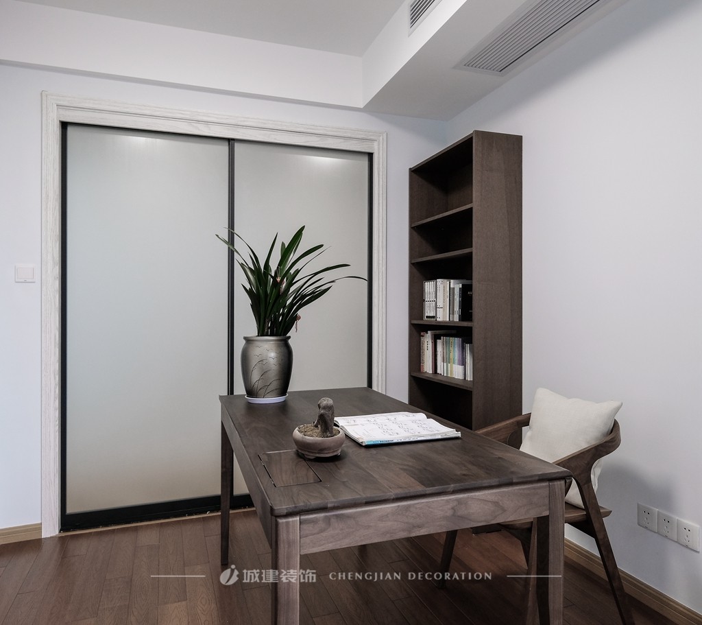 【書(shū)房】?jī)蓚€(gè)字:靜心。純白色墻面搭配黑胡桃色書(shū)桌書(shū)柜,極簡(jiǎn)舒心;窗邊席蒲團(tuán)而坐,品一壺好茶,身心愜意。